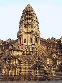 Angkor Wat, el templo principal del imperio, se mantiene como símbolo nacional y es un gran atractivo turístico. Construido a partir del siglo IX en un contexto hinduista (la diosa Visnú) a instancias del rey-dios Yavaryavan II, fue terminado por cada uno de sus sucesores quienes agregaban su propio templo. Con el advenimiento del budismo en el Imperio traído desde Sri Lanka, el templo se convierte también en monasterio de los monjes budistas.