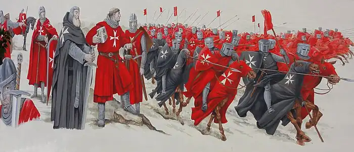 La Orden Hospitalaria de San Juan de Jerusalén, tras la pérdida de la Ciudad Santa trasladó su sede a Chipre, luego a Rodas hasta el año 1522 en que perdieron la isla, pasando su sede a Malta en 1530. Hasta nuestros días ha llegado el nombre abreviado de Orden de Malta ya que fue en Malta donde tenía la sede cuando se hizo famosa por frenar el avance turco en 1565. Los caballeros de la Orden eran conocidos como Hospitalarios y también como Sanjuanistas. En un principio, los hábitos de la Orden del Hospital de San Juan de Jerusalén eran negros, con una cruz blanca de ocho puntas (las ocho bienaventuranzas). A partir de 1259, los sanjuanistas cambian la sobreveste para la guerra por la de color rojo con una cruz blanca que cruza la vestimenta.