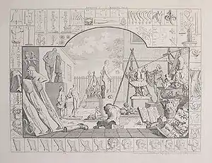 El siglo XVIII se fundamentó sobre una doble tendencia: el racionalismo cartesiano francés, que dio una estética normativa, reglamentada –lo que se reflejó en la aparición de las academias–, y el empirismo inglés, que ofrecía una estética más imaginativa. El arte también osciló entre la exuberancia tardobarroca del rococó y la sobriedad neoclasicista, entre la artificiosidad y el naturalismo. Comenzó a producirse cierta autonomía del hecho artístico: el arte se alejó de la religión y de la representación del poder para ser fiel reflejo de la voluntad del artista, centrándose más en las cualidades sensibles de la obra que no en su significado.[91] La Ilustración supuso el paso de una razón normativa a una crítica, donde el conocimiento es un proceso continuo, en transformación. El principal proyecto ilustrado fue la Enciclopedia, intento de síntesis del conocimiento universal, bajo la dirección de Diderot y D'Alembert.[92]