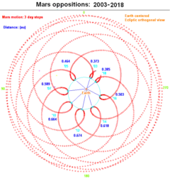 | Estos gráficos muestran la dirección y la distancia de Marte en relación con la Tierra en el centro, con oposiciones y movimientos retrógradas aparentes aproximadamente cada dos años y oposiciones cercanas que ocurren cada 15-17 años debido a la órbita excéntrica de Marte. | |