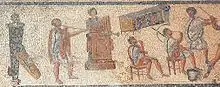 - La tibia ( aulos griegos - αὐλός ), generalmente doble, tenía dos tubos de doble caña (como en un oboe moderno), no unidos, pero generalmente jugados con un capistrum de banda bucal para sostener ambos tubos constantemente entre los labios del jugador.