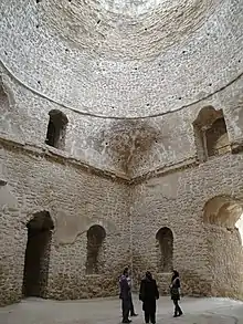 Muchos relatos escritos de fuentes medievales, árabes, bizantinas y occidentales, describen una estructura de cúpula de palacio sobre el trono del shahanshah Cosroes I. Decorado en azul y oro. La cúpula estaba cubierta con representaciones del sol, la luna, las estrellas, los planetas, el zodiaco y los reyes, incluido el propio Cosroes I. Según Adón de Viena y otros, la cúpula podía producir lluvia, y podía rotarse con un sonido como un trueno por medio de cuerdas tiradas por caballos desde un sótano.[11] El castillo de Qasr-e Shirin tenía una cámara abovedada al final de un largo iwan con bóveda de cañón. El antiguo monumento sasánida de Taq-i Kisra es el único resto visible de la antigua ciudad de Ctesifonte también puede haber llevado a una sala del trono abovedada.[12]