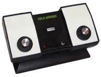 En 1975 salió al mercado el Telegames Pong, la primera consola doméstica de Atari distribuida por Sears.[nota 19] El nuevo producto, que permitía jugar a Pong en casa, obtuvo un éxito inmediato, vendiendo cerca de 150 000 unidades, generando una enorme cantidad de ingresos para la compañía y atrayendo a numerosos competidores.[nota 20] En las navidades de 1977 se podían contabilizar más de 60 copias diferentes del aparato de Atari, y solo en Estados Unidos habían sido vendidas 13 000 000 de unidades. La llegada de un nuevo tipo de microchip —el microprocesador— a finales de la década supuso una nueva revolución en la incipiente industria de los videojuegos.[38]