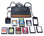 A principios de 1976 Atari se encontraba preparando uno de sus proyectos más importantes, la nueva consola Atari 2600 (también llamada Atari VCS) que iba a ser la primera en utilizar tecnología de microprocesador y la primera de la compañía en utilizar cartuchos intercambiables.[nota 30] Los problemas económicos por los que atravesaba la empresa hicieron retrasar el lanzamiento del nuevo aparato, y en agosto de 1976 apareció la nueva Fairchild Channel F, una máquina de una empresa rival que adelantaba por primera vez la tecnología de Atari, hasta entonces líder indiscutible del mercado. Con un precio de 169 dólares con 95 centavos, la nueva consola incorporaba dos juegos tipo Pong en su circuitería ROM, pero Fairchild también ofrecía cartuchos de juegos vendidos separadamente a 19 dólares con 95 centavos. El nuevo aparato fue un éxito, pero a inicios de 1977 RCA comercializaría una nueva consola similar, la RCA Studio II que no poseía gráficos en color pero se vendía por 20 dólares menos que el aparato de Fairchild. Bushnell había decidido vender su compañía para conseguir el capital que le permitiría sacar adelante su proyecto y en octubre de 1976 la multinacional Warner Bros. había comprado Atari por 28 millones de dólares convirtiéndolo en un millonario. En octubre de 1977, finalmente, salió al mercado la nueva consola de Atari con un catálogo de juegos muy superior al de sus competidoras, pero las ventas en las navidades de ese año estuvieron por debajo de las previsiones. En cualquier caso, a principios de 1978 el nuevo mercado de las consolas de videojuegos domésticas estaba ya perfectamente definido.[51]