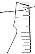 - Una línea norte-sur que se inicia en la avenida La Paz (desde donde se proponían 2 ramales hacia el norte: uno por avenida Independencia y otro por avenida Recoleta), sigue por calle Bandera y San Diego (desde donde surgirían 2 ramales hacia el sur: uno por la Gran Avenida, y el otro que iría por la entonces avenida San Joaquín hasta el sector de La Legua)