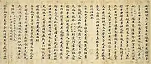 - Periodo de las Seis dinastías (220-618): se difundió más ampliamente el budismo, construyéndose grandes santuarios con estatuas colosales de Buda (Yungang, Longmen). Junto a esta nueva religión, y gracias a la ruta de la seda, se recibieron diversas influencias procedentes del oeste asiático. En pintura se formularon los seis principios, enunciados por Xie He a principios del siglo VI, y comenzó la caligrafía artística con la figura legendaria de Wang Xianzhi.[22]