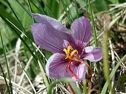 La historia del azafrán corresponde a uno de los cultivos más antiguos de la humanidad que se remonta a 3000 años[1] y abarca diferentes culturas, continentes, y civilizaciones. El azafrán, es una especia que se obtiene de los estigmas de la flor de Crocus sativus, planta que crece hasta alcanzar poco más de 15 cm de altura. Esta especia ha permanecido a lo largo de la historia y en todo el mundo como una de las sustancias más caras (en relación con su peso). Denominada a veces como «oro rojo», su valor suele estar comparado en proporción entre cinco veces al de la vainilla y cerca de treinta veces del cardamomo. Posee un sabor amargo, una fragancia similar al heno, así como unas notas ligeramente metálicas. El azafrán se ha utilizado tanto como condimento, fragancia, tinte, y fármaco contra algunas enfermedades. Se sabe que el azafrán es nativo del sudoeste de Asia,[2][3] pero fue cultivado inicialmente en Grecia.[4]