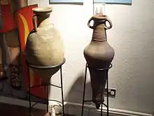 Los romanos continuaron con la tradición egipcia de almacenar y transportar el vino en ánforas selladas, pero sin embargo empezaron igualmente a emplear cubas de madera (un invento procedente del norte de Europa) y que posteriormente durante muchos siglos llegó a ser el recipiente normal para almacenar y transportar el vino.[1] El primer testimonio sobre la utilización del tonel data del año 51 a. C., en los Comentarios sobre la guerra de las Galias de Julio César.[35] Tenían la ventaja de ser más ligeras y menos frágiles, pero no eran capaces de mantener un vino de calidad durante años. Cada año hacían la vendimia y en ella participaban esclavos que se dedicaban a pisar los racimos; mientras realizaban esta operación pesaba sobre ellos la prohibición de comer y beber. El primer mosto obtenido se reservaba y se mezclaba con miel para realizar el mulsum, bebida que se servía al comienzo de los banquetes.[36] El resto se dejaba fermentar en grandes tinajas de barro que denominaban dolia.[34] El dolium era una gran tinaja enterrada hasta el cuello en el suelo para facilitar el control de temperatura. Tras el fermentado, el vino era tratado por el vinatero que le proporcionaba aromas. Los romanos preferían el vino blanco (en realidad de un color ambarino), razón por la cual los vinos tintos se blanqueaban, añadiéndoles productos para clarificar el vino tras la fermentación: cola de pez, polvo de mármol, clara de huevo, gelatina y en algunas ocasiones hasta sangre de cerdo. Las ánforas se dejaban envejecer, no en bodegas como se hace en la actualidad, sino en habitaciones altas de la casa (denominadas apotheca) generalmente cerca de las salidas de la chimenea lo que daba al vino un aroma a ahumado que gustaba mucho.[32][36] En algunas ocasiones se realizaban maceraciones en hierbas aromáticas, similares al procedimiento de obtención del vermut. Alguno de estos vinos aromatizados (vinum conditum) son el nectaulis (que poseía enula), el murtidanum (aromatizado con mirto), el vinum absinthiatum aromatizado con ajenjo (Artemisia absinthium). El gusto de los romanos hacía que algunos de los vinos, tras la fermentación, se solían madurar en ánforas entre 15 a 25 años. Era conocida entre los legionarios una bebida refrescante, mezcla de agua y vinagre, denominada posca.