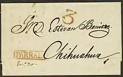 Carta sin estampillas, valorada en 3 reales enviada en 1852 de Parral, Chihuahua a la ciudad de Chihuahua. - Mazatlán: Copman y Lomer; Kennedy; Talbot, Parrot (Cónsul de los Estados Unidos); Scarborough & Co .; Smith & Mason