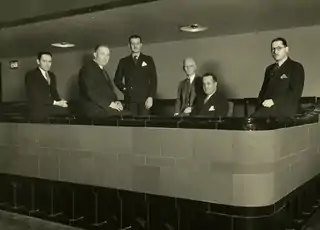 El equipo de arquitectura del Municipal Auditorium de Kansas City. (De izquierda a derecha) William L. Cassell, Edwin M. Price, Homer F. Neville, Henry F. Hoit, Alonzo H. Gentry, Alfred E. Barnes. Noviembre de 1935. Carpeta 6; Alfred Edward Barnes (1892-1960) Registros arquitectónicos (K0004); El Centro de Investigación de la Sociedad Histórica del Estado de Misuri-Kansas City. Foto tomada por The Harkins Commercial Photo Co. Kansas City, MO.