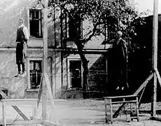 Algunos campesinos polacos participaron en la Judenjagd ("caza de judíos") organizada por los alemanes en el campo, donde según Jan Grabowski, aproximadamente el 80% de los judíos que intentaron esconderse de los alemanes acabaron asesinados.[195][196] Polacos y ucranianos también cometieron pogroms en tiempos de guerra, como el pogromo de Jedwabne[197] y los Pogromos de Lviv.[198] Según Grabowski, el número de víctimas de los "Judenjagd" podría alcanzar las 200 000 sólo en Polonia;[199] Szymon Datner dio una estimación más baja: 100 000 judíos que "cayeron presa de los alemanes y sus ayudantes locales, o fueron asesinados en diversas circunstancias inexplicables. "[200]