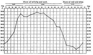 Si una entidad está controlada homeostáticamente, no implica que su valor sea necesariamente absolutamente estable en salud. La temperatura corporal interna, por ejemplo, está regulada por un mecanismo homeostático con sensores de temperatura en, entre otros, el hipotálamo del cerebro.[9] Sin embargo, el punto de ajuste del regulador se restablece periódicamente.[10] Por ejemplo, la temperatura corporal central en los seres humanos varía durante el transcurso del día (es decir, tiene un ritmo circadiano), siendo las temperaturas más bajas por la noche y las más altas por las tardes. Otras variaciones normales de temperatura incluyen las relacionadas con el ciclo menstrual. El punto de ajuste del regulador de temperatura se restablece durante las infecciones para producir fiebre.[11] Los organismos son capaces de adaptarse algo a condiciones variadas, como cambios de temperatura o niveles de oxígeno en la altitud, mediante un proceso de aclimatación.