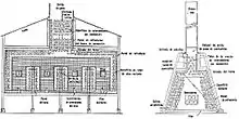 En los hornos se encuentra una zona de radiación donde el fuego pega directamente sobre los tubos horizontales o verticales (hornos de tipo rectangular) o sobre un serpentín helicoidal (hornos de tipo circular).[12] Por encima se encuentra una zona de convección que aprovecha el calor de los gases de combustión que suben desde la sección de radiación y calienta algún producto intermedio.[13]