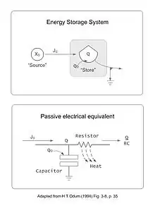 Odum usó un sistema análogo a las redes de energía eléctrica para modelar las rutas de flujo de energía de los ecosistemas.[15] Los modelos eléctricos analógicos de Odum tuvieron un papel significativo en el desarrollo de su enfoque de los sistemas y han sido reconocidos como uno de los primeros ejemplos de ecología de sistemas.[16] El flujo de electrones en la red eléctrica representaba el flujo de material (por ejemplo, carbono) en el ecosistema, la carga en un condensador era análoga al almacenamiento de un material.