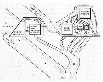 Desde este punto de vista, los ciclos biogeoquímicos son impulsados por la energía radiante.[1] Odum expresó el equilibrio entre la entrada y salida de energía como la relación entre producción (P) y respiración (R): P-R. Clasificó los cuerpos de agua en función de sus relaciones de PR: "sus mediciones del metabolismo del flujo de agua eran mediciones de sistemas completos. Odum estaba midiendo la comunidad como un sistema, no sumando el metabolismo de los componentes como Lindeman y muchos otros lo habían hecho ".[28] Este razonamiento parece haber seguido al del supervisor de doctorado de Odum, G.E.Hutchinson, quien expresó la opinión de que si una comunidad fuera un organismo, entonces debe tener una forma de metabolismo.[29] Sin embargo, Golley señala que H.T.Odum intentó ir más allá del informe de meras proporciones, un movimiento que resultó en el primer desacuerdo sobre en sistemas energéticos.