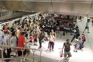 Después de que se aprobó el proyecto de Hudson Yards en 2005, la MTA recibió los ingresos de la oferta inicial de bonos de 2006 para pagar la extensión de la Línea 7 hasta la estación Calle 34–Hudson Yards.[45] Con el financiamiento asegurado, la MTA procedió rápidamente a construir la extensión.[46] Los primeros contratos de construcción se adjudicaron en octubre de 2007.[47][48] Después de una serie de retrasos relacionados con la construcción de la estación de la calle 34, la extensión del metro se inauguró el 13 de septiembre de 2015.[49][50] La estación se conecta a edificios y desarrollos cercanos, incluidos 30 Hudson Yards[51] y Hudson Park and Boulevard.[52] La entrada principal de la estación de la calle 34, las escaleras mecánicas y un elevador en el lado oeste de Hudson Park y Boulevard entre las calles 33 y 34, está al pie de 55 Hudson Yards y está a solo media cuadra del borde norte del patio de trenes.[53] No se construyó otra estación, planeada para la Décima Avenida y la Calle 41.[54]