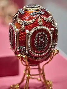 Se caracteriza, además de por su color vivo, por cuatro paneles ovales orlados de perlas, colocados a lo largo de la banda mediana, cada uno de los cuales lleva en el centro, en diamantes, una de las cifras que componen el año 1893; este es el primero de los huevos imperiales conocidos que lleva fecha.