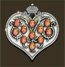 Dentro hay un caballete de oro coronado por una estrella de Belén engastada con diamantes dentro de una corona sobre el año; el caballete está estriado y adornado con motivos florales y de antorchas de oro tallado y está engastado con gemas y perlas. Sobre él descansa una placa en forma de corazón esmaltada en blanco opalescente sobre un fondo guilloché rayo de sol y bordeada por diamantes rosas engastados en plata y coronado por la corona Romanov también en diamantes. Once diminutas cubiertas translúcidas de oro esmaltado en tono fresa, cada una con su propio monograma, están conectadas por una gran "M" de diamantes para formar una decoración para el frente de esta placa.[1]