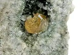 Suele encontrarse asociado a otros minerales como: grosularia, wollastonita, forsterita, monticellita, cuspidina, fluoborita, ludwigita, espinela, brucita, calcita, dolomita, serpentina, diópsido, corindón, flogopita o pirrotita.