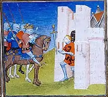 ![]() Representación medieval tardía de Hunaldo rindiendo la fortaleza de Loches a Pippin. De hecho, Pipino tomó el baluarte pero no a Hunaldo. | ||