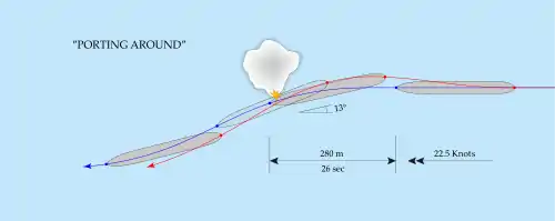 Alrededor de 37 segundos después, la nave giró, aunque chocó contra el iceberg a estribor.[28] El choque fue de modo más bien intermitente más que contacto continuo e hizo que se soltaran los remaches de las planchas de la obra viva por 100 m de la eslora y se abrió una vía de agua en el casco por 5 m debajo de la línea de flotación.[28] Las puertas estancas se cerraron inmediatamente por orden de Murdoch para evitar el aumento de las inundaciones. A pesar de ello, el agua comenzó a inundar los primeros cinco compartimientos.[33] El Titanic solo podía flotar con cuatro de sus compartimentos llenos de agua.[34] Por otra parte, los mamparos no cubrían toda la altura de la embarcación. Así, una vez que los primeros compartimentos estaban completamente inundados, el agua desembocaba en el siguiente. La proa del Titanic comenzó a hundirse (el barco tomó un ángulo negativo). A las 23:50, el nivel del mar había aumentado 4 metros en la proa y los primeros cinco compartimentos estancos estaban comenzando a inundarse así como la sala de calderas.[35]
