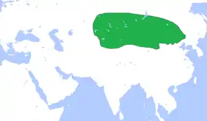 Según las crónicas de la antigua China, los xiongnu eran un pueblo nómada de ganaderos y guerreros, que vivía en las estepas orientales al norte de la Gran muralla. La dinastía Qin pudo rechazar sus ataques de forma más o menos eficaz, pero tras la caída de esta, los xiongnu lograron superar la Gran muralla e iniciar una serie de incursiones en territorio chino.[15] Los xiongnu también combatieron contra otros pueblos nómadas, y durante el mandato del chanyu[16] Modun (209-174 a. C.)[17] derrotaron a las tribus de los donghu, dingling y hunyu, unificando por primera vez las estepas mongolas. Su hijo y sucesor, Laoshang, expandió el control xiongnu hacia la cuenca del Tarim, en donde derrotó al pueblo de los yuezhi, forzándolos a migrar a las regiones de Bactriana y Gandara, donde estos formarían el Imperio kushán. El emperador Wen de la dinastía Han quiso alejar el peligro pagándoles tributos (preferentemente seda y cereales), algo que con el tiempo sería una constante en la relación de los xiongnu con otros pueblos hasta varios siglos después. Los bienes que la corte xiongnu recibía cada año eran tan abundantes que los intercambiaban con notables beneficios a los comerciantes de occidente que llegaban por la Ruta de la seda. También hubo matrimonios de conveniencia entre princesas chinas y miembros de la aristocracia xiongnu con el fin de sellar la paz.