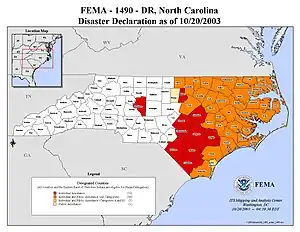- Federal Emergency Management Agency (2003). «President Orders Disaster Aid For North Carolina Hurricane Victims». Archivado desde el original el 5 de octubre de 2006. Consultado el 16 de diciembre de 2006.
