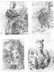 En realidad, Rigaud pintará un segundo cuadro, elevando a tres las poses presentadas a Coysevox. Se trata de un óvalo conservado en una colección privada,[64] copiado por Géricault[65] y objeto de un bello grabado de Drevet. Igualmente, lleva al lienzo el retrato de su hermana Claire, acompañada de su esposo y su primera hija.[66]