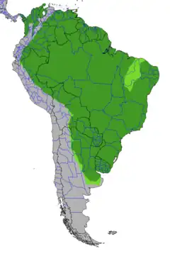 Su enorme área de distribución comprende casi toda Sudamérica al este de los Andes en las cuencas del río Orinoco, del Amazonas y del Río de la Plata; cubriendo desde el este de Venezuela y la Guyana hasta Uruguay, Paraguay y en gran parte del norte de Argentina, mayormente en la provincia de Corrientes.[16]