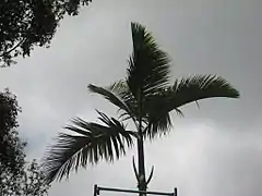 La palmera es de aproximadamente 12 metros de altura con un tronco gris relativamente delgado con una corona cerácea. Se relaciona con la palma de botella y la palma del huso. Se dice que se parecen a la variedad verde de la Hyophorbe indica.