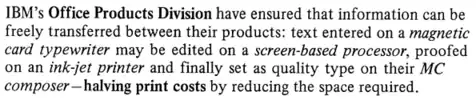 En 1966, IBM lanzó la Selectric Composer. Esta Selectric muy modificada[4] producía copias listas para la fotocomposición usando tipografías proporcionales en una amplia variedad de estilos de fuente, desde 8 a 12 puntos. Material preparado en una máquina bien ajustada por un operador hábil y hecho sobre papel recubierto de barita (sulfato de bario) "llevaría a un experto a decir... no está hecho con una máquina de linotipo o monotipo".[5]