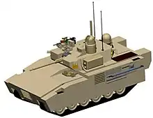 un vehículo blindado de combate que está diseñado y equipado principalmente para transportar un escuadrón de infantería de combate, y que está armado con un cañón integral u orgánico de al menos 20 milímetros de calibre y, a veces, un lanzador de misiles antitanque[3]