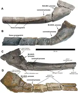 El espécimen holotipo, BRSMG Cg3178, fue descubierto entre los sedimentos de la formación Westbury cerca de Blue Anchor en Somerset, Reino Unido. El primer fragmento se encontró en 2020, y expediciones posteriores hasta 2022 revelaron más piezas. El ejemplar está formado por fragmentos de un suprangular derecho: sus características histológicas sugieren que el espécimen todavía estaba creciendo, por lo que era un subadulto o un adulto joven.[2]