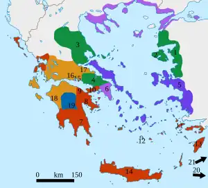 - Griego arcaico: se estima que alrededor del ii milenio a. C. llegó al Peloponeso y algunas islas del mar Egeo la primera ola de hablantes de dialectos griegos. Se han identificado como los ἀχάιοι (akháioi, 'aqueos') de Homero y los ahhiyawa de las fuentes hititas. El habla de los aqueos parece ser la base de los posteriores dialectos jónico-áticos. Los habitantes prehelénicos de la península (pelasgos) fueron desplazados o absorbidos por los hablantes griegos, aunque dejaron un substrato patente sobre todo en la toponimia. También dejó cierto sustrato lingüístico la lengua no indoeuropea de los minoicos, que se ha conservado escrita en lineal A, aunque no ha sido descifrada todavía. Los aqueos dieron lugar a la civilización micénica, de la que se han conservado inscripciones en escritura lineal B, derivada de la escritura lineal A minoica. La lengua de estas inscripciones en bustrófedon es claramente una forma de griego, bastante uniforme a lo largo de todo su dominio, que se conoce como griego micénico. En el siglo xi a. C. la civilización micénica llegó a su fin a causa de las invasiones de otro grupo griego, hablantes de dialectos dóricos. El lineal B dejó de usarse y comenzó una «época oscura» sin testimonios escritos directos. Entre los siglos xi y viii a. C. se escribieron los poemas homéricos, basados en una tradición oral anterior que se remontaría a la época micénica. Estos poemas fueron escritos en una mezcla de dialectos eolios y dialectos jónicos y en un alfabeto basado en un modelo fenicio, que acabaría derivando en el alfabeto griego clásico.