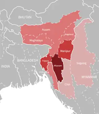| Región | Mizoram, Tripura, Assam, Manipur, Meghalaya, Estado Chin, Sagaing, Nagaland, Chittagong Hill Tracts | |