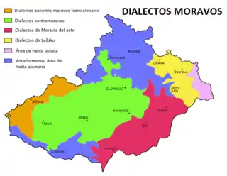 ![]() Mapa de Moravia y Silesia checa (fronteras entre las dos regiones no mostradas) indicando el mayor grupo dialectal: Moraviano central Moraviano oriental Lachiano Bohemio-moraviano Silesiano cieszyn Dialectos mixtos (Estos últimos en áreas anteriormente habitadas por alemanes, reasentados después de su expulsión en 1945).