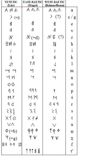 Tirsénica Rético (ver etrusco) | |
