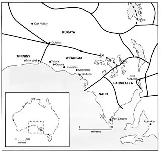 Debido a los intensos contactos culturales en la mitad sur de Australia del Sur, que trajeron dislocación y cambio cultural, los estilos de vida tradicionales y las formas tradicionales de hablar declinaron durante los siglos XIX y XX. En el caso de Wirangu, el establecimiento de la Misión Koonibba en 1898 trajo un contacto intenso con otros idiomas, en particular el Lengua kokatha. Como la mayoría de las lenguas aborígenes australianas, las dos lenguas comparten un ancestro común en las lenguas pama-ñunganas, pero mientras Wirangu es una lengua Thura-Yura, Kokatha se define como una dioma Wati. Los idiomas vecinos a menudo toman prestadas palabras entre sí, y los nuevos e intensos contactos en Koonibba dieron lugar a una afluencia significativa de palabras en kokatha que se han convertido en parte del Wirangu actual.[1]