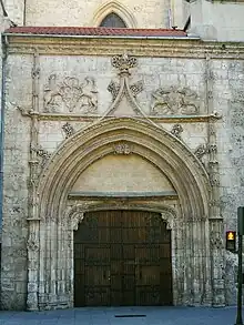 La portada, practicada en la nave del Evangelio, mirando al río, se abre con arco apuntado rebajado y arquivoltas de finas labores vegetales. El arco de la puerta es carpanel y el tímpano se muestra vacío de bultos o relieves. El trasdós queda enmarcado por un arco conopial con cardinas y remate en cogollo, al que flanquean los escudos de armas de las familias Castillo y Pesquera asidos por grifos. El par de finas columnillas adosadas en sus flancos termina de dar a ésta portada el aspecto inconfundible del arte gótico flamígero. La torre con chapitel que se yergue sobre la portada es ya un aditamento neogótico.