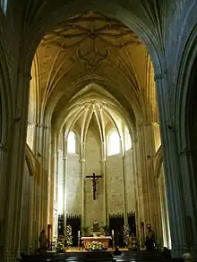 El interior presenta tres naves de cuatro tramos, la central más elevada, que terminan en sendos ábsides poligonales, más profundo el principal, heptagonal y abierto con ventanales ojivales en cuatro de los ochavos. La mayoría de las bóvedas son de crucería compleja, destacando las de los tramos de la nave central y la del crucero, con finas nervaduras dibujando terceletes y combados. Los pilares que forman el crucero están unidos por dos arcos diafragmas en los brazos del transepto.