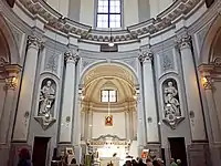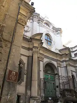 La iglesia, accesible mediante una elegante doble escalera de piperno, tiene planta central para aprovechar al máximo el estrecho espacio disponible; esta opción arquitectónica contribuye al equilibrio del espacio del vano circular, subrayado por parejas de columnas de orden corintio.
