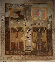 En el interior del edificio se conservan diferentes piezas artísticas, siendo la principal una imagen en estuco de grandes dimensiones del Cristo en Majestad, enmarcada por un mural con pinturas al fresco que describen escenas del Calvario, obras del siglo XII.[1]