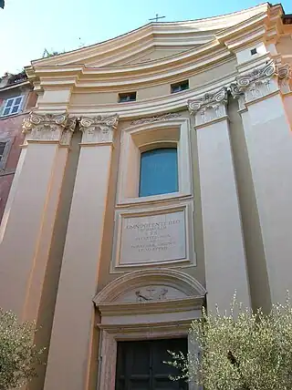 La fachada de la iglesia es ligeramente cóncava y sobre el portón de entrada hay una inscripción que recuerda a los dos santos a cuya memoria está dedicado el templo.