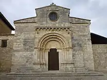 Esta fachada presenta una rica escultura monumental en la portada y en los canecillos del voladizo superior. En la portada, presentan decoración escultórica los capiteles, con motivos vegetales y temas animalísticos (dos salamandras enroscadas, dos pavos afrontados bebiendo una copa de vino). En la parte superior de la apertura, dos ménsulas, que ejercen de dintel para soportar el tímpano, representan dos caras barbudas mordiéndose la punta de la barba. En el tímpano, una faja de florones de ocho pétalos con perlitas en los nervios siguiendo la arquivolta, otros de once pétalos con los nervios resaltados, decorando, dos y dos, el resto del tímpano, y un escudo circular con una flor de cuatro pétalos en forma de cruz, en el centro, en la parte superior. El tímpano lleva la inscripción ERA MCCXXXIII (año 1195) precedida por una clave de sol.[18] Los canecillos representan cabezas de animales y personas sacando la lengua en actitud burlesca.[20]