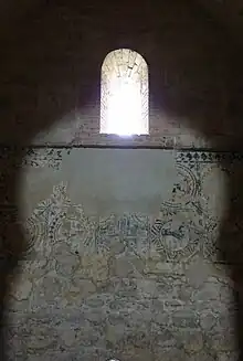 La capilla mayor contiene restos de pintura mural del siglo X, de estilo mozárabe.[16] Se trata de una composición en cuadrícula, enmarcada por una decoración en rombos, donde en cada cuadrado se inscribe un círculo, que contiene temas geométricos o cuadrúpedos. Es una composición típica del arte visigodo, de origen oriental, que imita los paños orientales que se colgaban en los muros, decorados con una riquísima iconografía. Este mural indica una tendencia anicónica, que evita representaciones figuradas de la divinidad, propia de ciertos ambientes de la élite monástica de la época.[17]