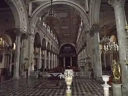 Desde el acceso apreciamos cuatro columnas de menor tamaño, las cuales presentan un capitel de orden jónico, en este lugar marcado por las columnas indicaba el espacio hasta el cual podían ingresar los no cristianos o no bautizados. Luego en la Nave central, lugar donde ya podían ingresar los Cristianos, está compuesto por arcadas de medio punto, con columnas (52) alineadas perfectamente, la Nave remata en un gran arco, el cual divide el lugar en dos, y muestra el inicio del altar.