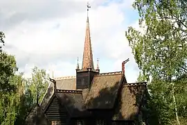 Además de la planta, su techo en dos aguas, la torre del crucero con su agudo chapitel y sus pináculos, y la decoración de dragones en el caballete del techo recuerdan a la iglesia de madera de Lom, aunque en una versión de menor tamaño.