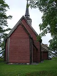 Además de los postes esquineros (stav), hay postes en medio de los muros y uno más en medio de la nave. En los costados norte y sur la iglesia tiene puntales que proporcionan soporte adicional a los muros, característica esta última sólo compartida con la iglesia de madera de Rødven.
