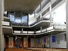 En la última fase de reconstrucción de la iglesia , en 1957, se introdujo un nuevo órgano moderno con teclado y sistema de transmisión electrónicos.[4]