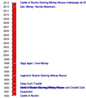 | Primer videojuego | Castle of Illusion Starring Mickey Mouse (20 de noviembre de 1990) | |